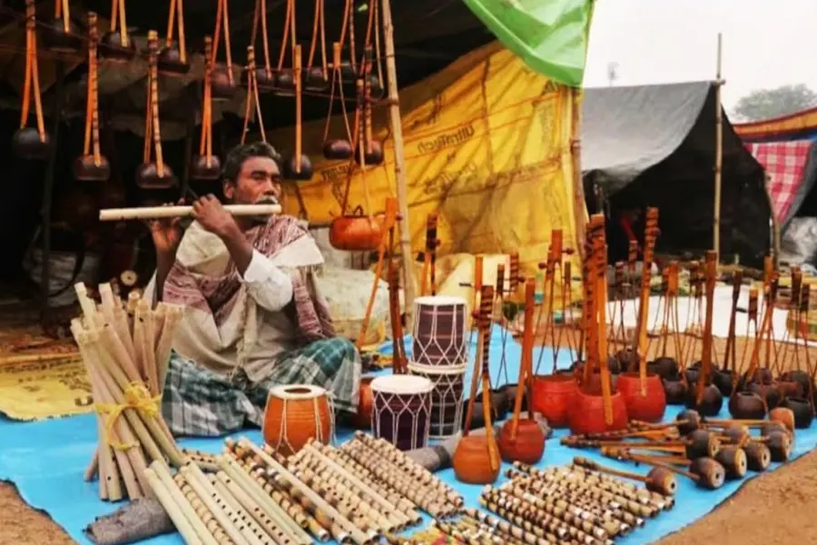 শান্তিনিকেতনের পৌষমেলায় হাতে গড়া বাদ্যযন্ত্রের নিদর্শন