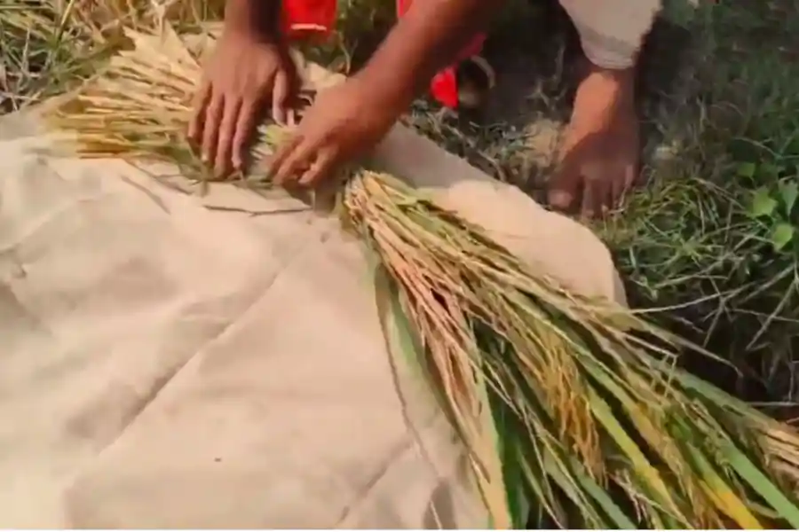 স্থানীয় গৃহবধূ মুনমুন ঘোষ জানান, “মাঠের এক কোণে সামান্য ধান কেটে আমরা প্রথমে বাড়িতে আনি। এটাকেই দেবী লক্ষ্মীর প্রতীক ধরা হয়। এর পরেই মূল ফসল তোলা শুরু হয়।”