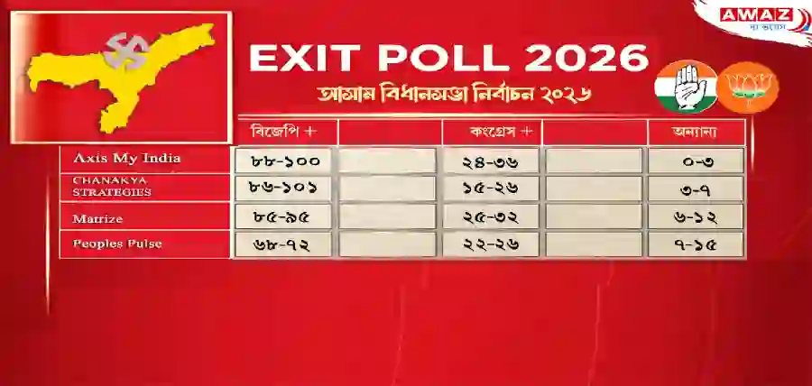 অসম বিধানসভার ১২৬টি আসনে ভোটগ্রহণ হয়েছে এবং সরকার গঠনের জন্য প্রয়োজন ৬৪টি আসন। অধিকাংশ এক্সিট পোলে বিজেপি জোটকে স্পষ্ট এগিয়ে থাকতে দেখা যাচ্ছে।