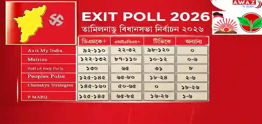 ‘People’s Pulse’-এর সমীক্ষা অনুযায়ী, ডিএমকে জোট ১২৫ থেকে ১৪৫টি আসন পেতে পারে, আর এআইএডিএমকে জোট ৬৫ থেকে ৮০টি আসনের মধ্যে থাকতে পারে। অভিনেতা বিজয়ের টিভিকে (TVK) দলও কিছু আসনে সাফল্য পেতে পারে বলে অনুমান করা হয়েছে।