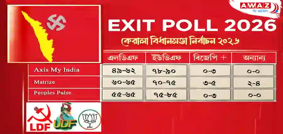 ‘Axis My India’-র মতে, কেরলে ইউডিএফ ৭৮ থেকে ৯০টি আসন পেতে পারে, जबकि ক্ষমতাসীন এলডিএফ ৪৯ থেকে ৬২টি আসনে সীমাবদ্ধ থাকতে পারে। বিজেপি জোট ০ থেকে ৩টি আসন পেতে পারে বলেও পূর্বাভাস দেওয়া হয়েছে।