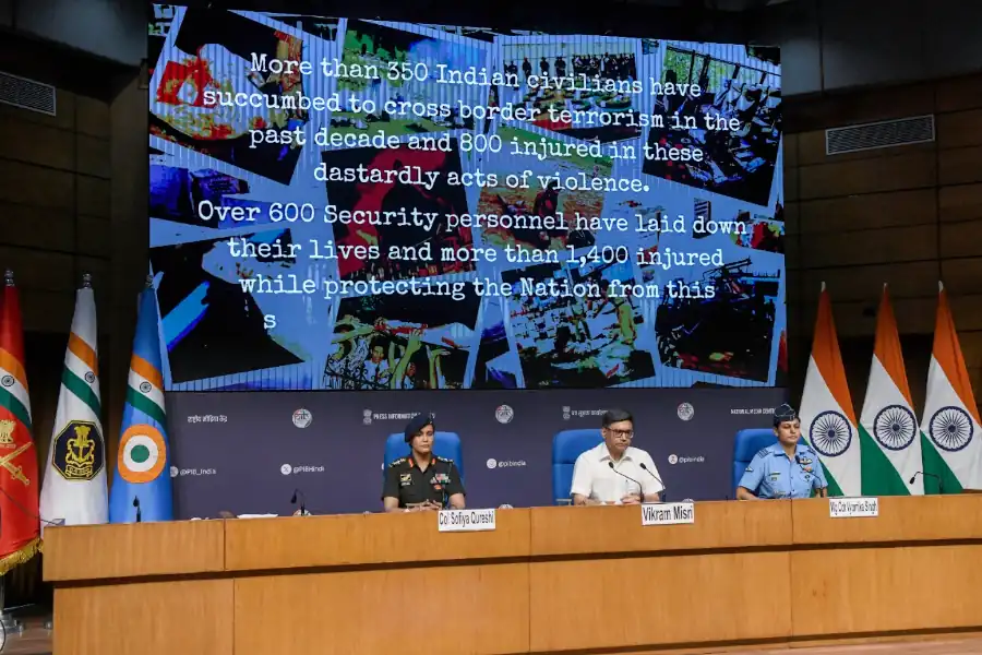 ভারতের বিদেশ সচিব বিক্রম মিশ্রীর সঙ্গে ভারতীয় সেনাবাহিনীর কর্নেল সোফিয়া কুরেশি ও উইং কমান্ডার ভ্যোমিকা সিং