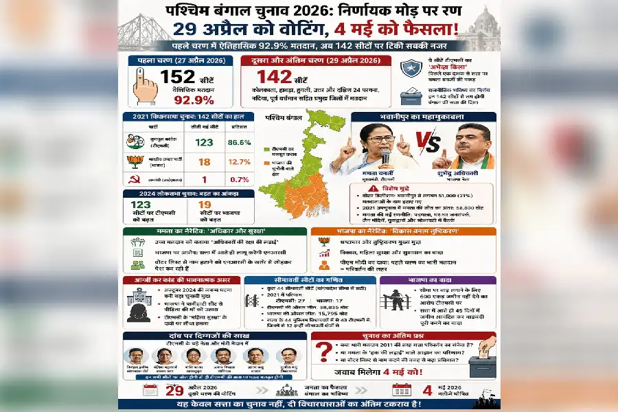 পশ্চিমবঙ্গ বিধানসভা নির্বাচন ২০২৬-এর প্রথম দফায় ১৫২টি আসনে হওয়া ঐতিহাসিক ৯২.৯ শতাংশ ভোটদান রাজ্যের রাজনৈতিক উত্তেজনাকে চরমে পৌঁছে দিয়েছে। এখন সবার নজর ২৯ এপ্রিল অনুষ্ঠিত হতে চলা দ্বিতীয় ও শেষ দফার ১৪২টি আসনের দিকে। এই আসনগুলিই মুখ্যমন্ত্রী মমতা বন্দ্যোপাধ্যায়ের নেতৃত্বাধীন তৃণমূল কংগ্রেসের সেই ‘অভেদ্য দুর্গ’, যা গত এক দশক ধরে বাংলার ক্ষমতার দিশা নির্ধারণ করেছে।