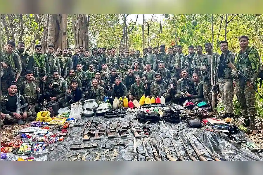 বোকারোতে নকশালদের সঙ্গে সংঘর্ষের পর উদ্ধারকৃত অস্ত্র ও গোলাবারুদ নিয়ে নিরাপত্তা বাহিনীর সদস্যরা