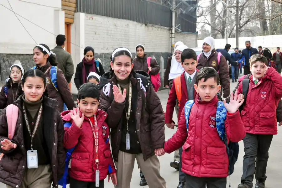 চিল-এ-কালান শুরু হওয়ায় স্কুলের বাচ্চারা গুলমার্গে পিকনিকে যাওয়ার এক দৃশ্য