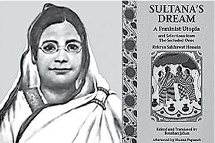 বেগম রোকেয়া ও তাঁর রচিত 'Sultana's Dream' বইয়ের একটি ছবি (ফাইল)