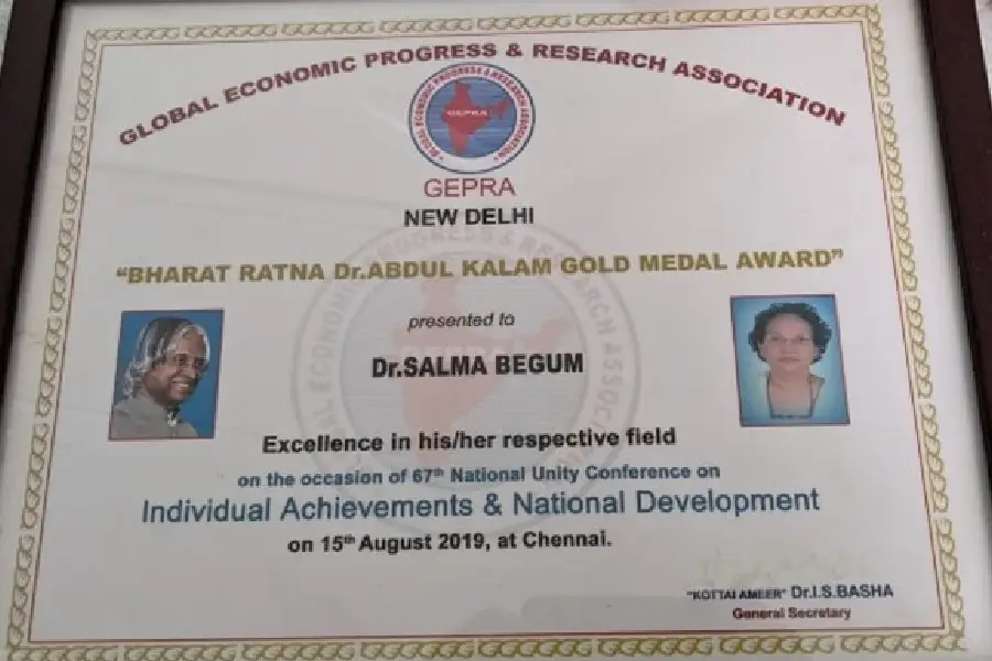 ড. সালমা বেগমকে চেন্নাইয়ে অনুষ্ঠিত ৬৭তম জাতীয় ঐক্য সম্মেলনে GEPRA-র পক্ষ থেকে ভারতরত্ন ড. আব্দুল কালাম গোল্ড মেডেল অ্যাওয়ার্ডে সম্মানিত করা হয়