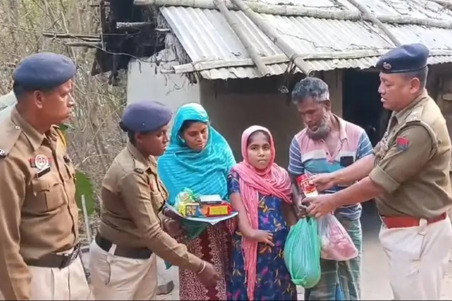 বিশ্রামগঞ্জ থানার ওসি অজিত দেববর্মা ও তাঁর সহকর্মীরা তাসলিমাকে সাহায্য প্রদান করা মুহূর্তের একটি দৃশ্য