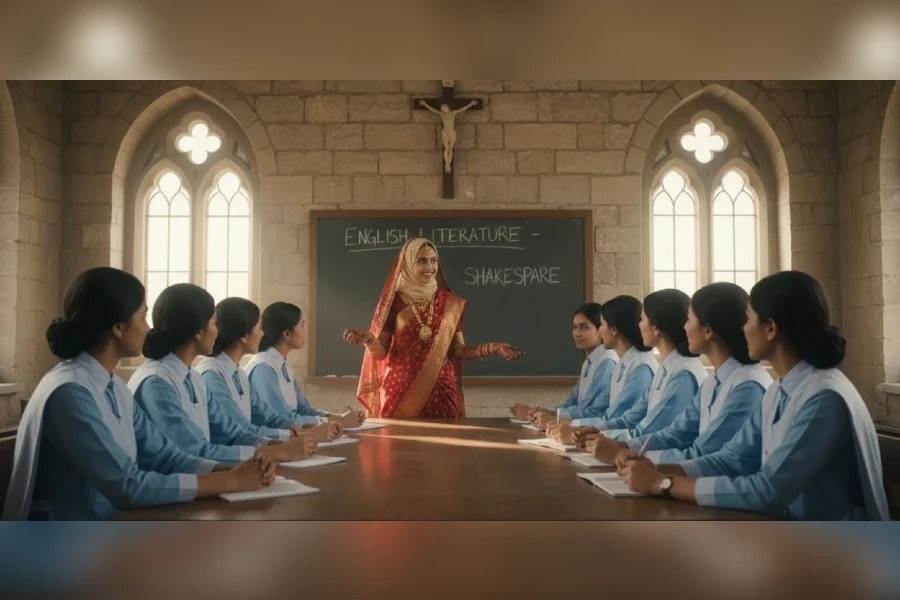 চুরা, সিঁদুর এবং মঙ্গলসূত্র পরা একজন মুসলিম ইংরেজি শিক্ষকের ছবি (AI- জেনারেটেড)