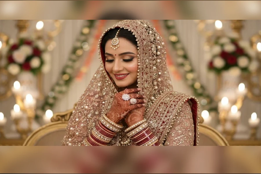 চুরা, সিঁদুর এবং মঙ্গলসূত্র পরা একজন মুসলিম কনের ছবি (AI- জেনারেটেড)