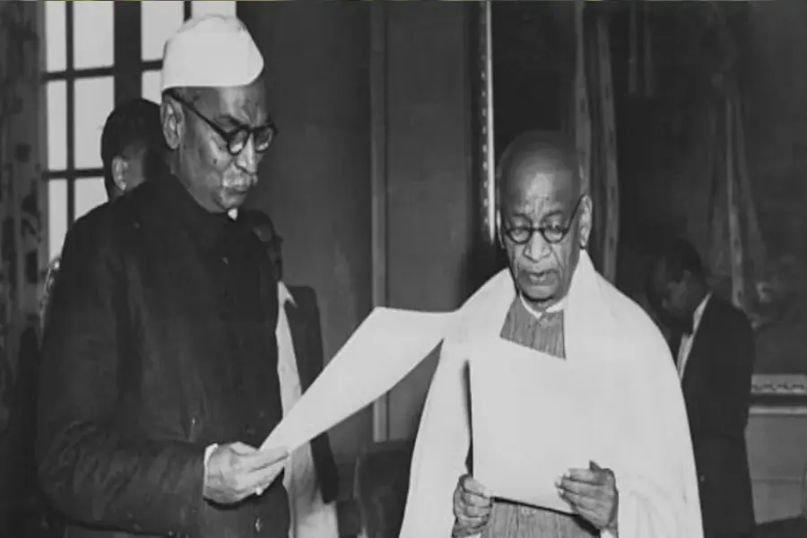 রাষ্ট্রপতি ড. রাজেন্দ্র প্রসাদ সর্দার বল্লভভাই প্যাটেলকে শপথ বাক্য পাঠ করানোর একটি মুহূর্তের ছবি