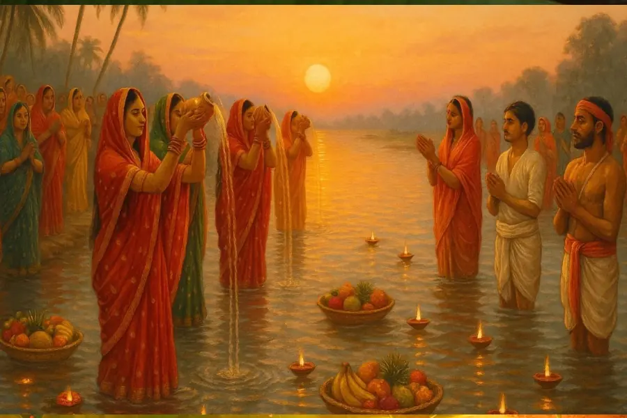 এই দিনে ভক্তরা নদী বা পুকুরে দাঁড়িয়ে অস্তগামী সূর্যকে ফল ও থেকুয়া অর্পণ করে। বৈজ্ঞানিক দিক: অস্তসূর্যের কোমল রশ্মি শরীরের বায়ো-রিদম ঠিক রাখে, জলে দাঁড়ানো রক্তচাপ নিয়ন্ত্রণে সাহায্য করে এবং ধ্যান মনকে শান্ত করে।