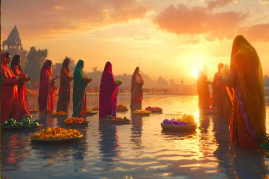 'ঊষা অর্ঘ্য' উপলক্ষে উদীয়মান সূর্যকে অর্ঘ্য প্রদান করার ছবি ( এ আই)