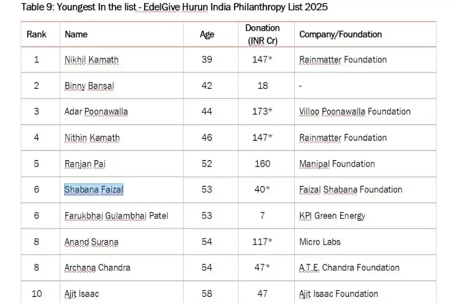 EdelGive Foundation ও Hurun Research Institute-এর প্রকাশিত ১২তম বার্ষিক প্রতিবেদন জানাচ্ছে, গত তিন বছরে ভারতের ১৯১ জন দাতা মোট ১০,৩৮০ কোটি টাকা অনুদান দিয়েছেন, যা গত বছরের তুলনায় প্রায় ৮৫ শতাংশ বেশি। এর মধ্যে শিক্ষাক্ষেত্রই সবচেয়ে বেশি অনুদান পেয়েছে, প্রায় ৪,১৬৬ কোটি টাকা। এই তালিকায় নারী দাতাদের মধ্যে দশম স্থানে রয়েছেন শাবানা ফয়জল, যিনি পরিবারের পক্ষ থেকে মোট ৪০ কোটি টাকা অনুদান দিয়েছেন। তাঁর অবস্থান তাঁকে শুধু শীর্ষ দাতাদের মধ্যে স্থান দেয়নি, করেছে সর্বকনিষ্ঠ নারী দাতাও।
