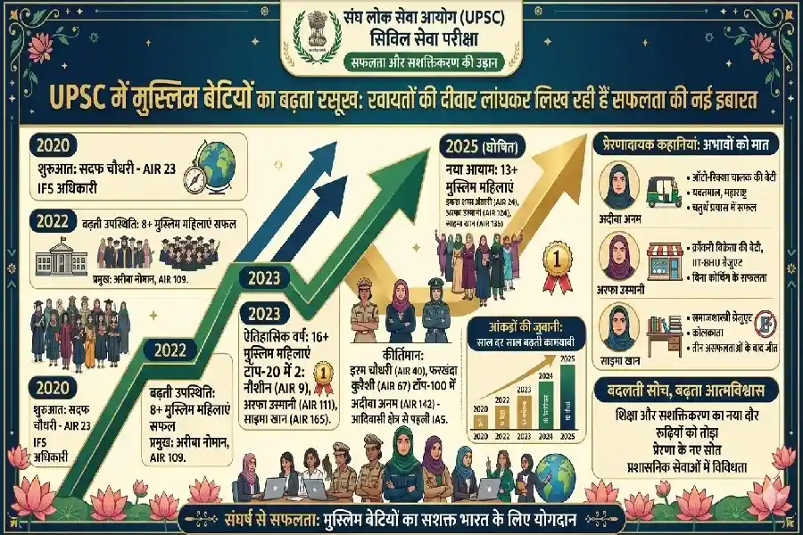 ইউপিএসসি পরীক্ষায় মুসলিম প্রার্থী, বিশেষ করে মহিলাদের বাড়তে থাকা উপস্থিতি বৃহত্তর সামাজিক পরিবর্তনেরই ইঙ্গিত দেয়। ২০২০ সালে যেখানে সদাফ চৌধুরী ২৩তম স্থান পেয়ে মুসলিম প্রার্থীদের মধ্যে শীর্ষে ছিলেন, ২০২৩ ও ২০২৪ সালে সেই সংখ্যা আরও বেড়েছে। ২০২৫ সালের ফলাফলে ১৩ জনেরও বেশি মুসলিম মহিলা সফল হয়েছেন। ইরাম চৌধুরী (সর্বভারতীয় ক্রম ৪০) এবং ফারখন্দা কুরেশি (সর্বভারতীয় ক্রম ৬৭)-এর মতো নাম এখন সমাজে অনুপ্রেরণার প্রতীক হয়ে উঠেছে।